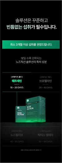 최소 3개월 이상 꾸준한 섭취가 효과를 보기에 좋다고 안내하고 있으며, 실제로 노즈픽션의 구성 성분은 10일~90일까지 단계적으로 작용하기 때문에 지속적인 복용이 필수적입니다.